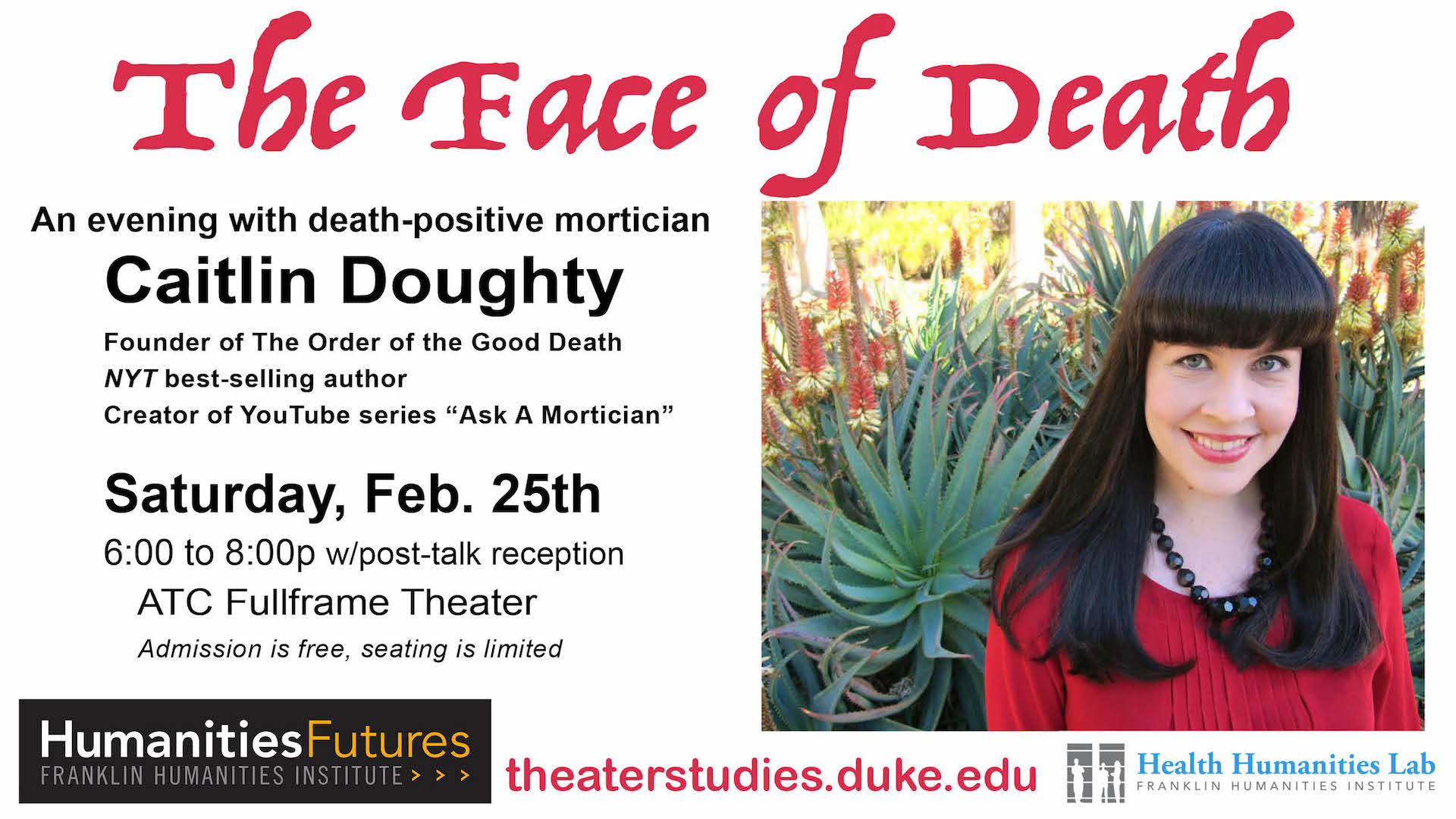 Caitlin Doughty, American mortician, NYT best-selling author, and YouTube personality discusses the role of storytelling in her advocacy work for popular acceptance of death as a part of life. Duke faculty members Jules Odendahl-James (Theater Studies) and Jehanne Gheith (Slavic and Licensed Clinical Social Worker for Duke Hospice) introduce and a light reception follows.