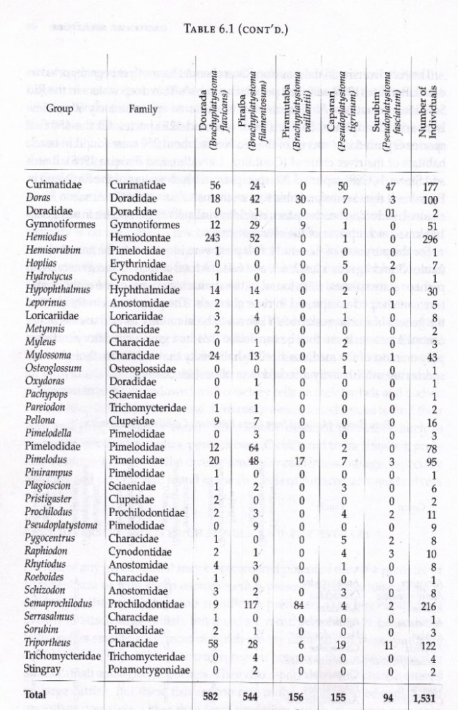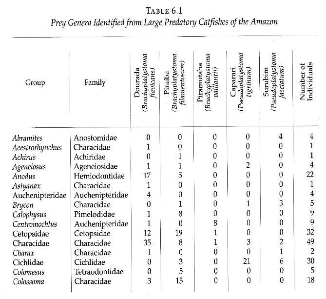 This registration exercise of prey for each of the big catfish led to an excellent documentation of predator–prey relationships, which are known through technical papers and scientific research, such as important studies by Goulding and Barthem (1997). These renowned researchers generated a table that relates big catfish with their prey for a total of 54 species, following the analysis of stomach contents during several years of study. In the final figures, the dorado catfish showed a consumption of 39 species, followed by the lechero with 38, the pintadillo tigre with 25, pintadillo rayado with 17, and the pirabulón with 7 species.